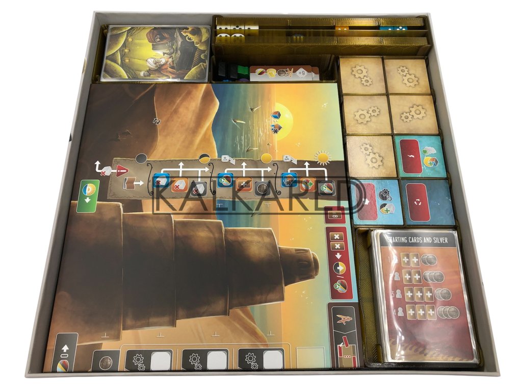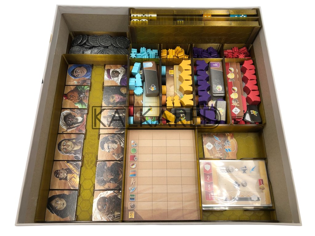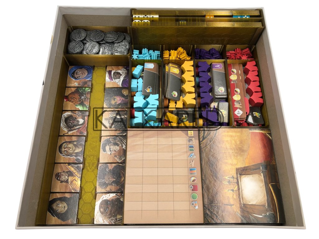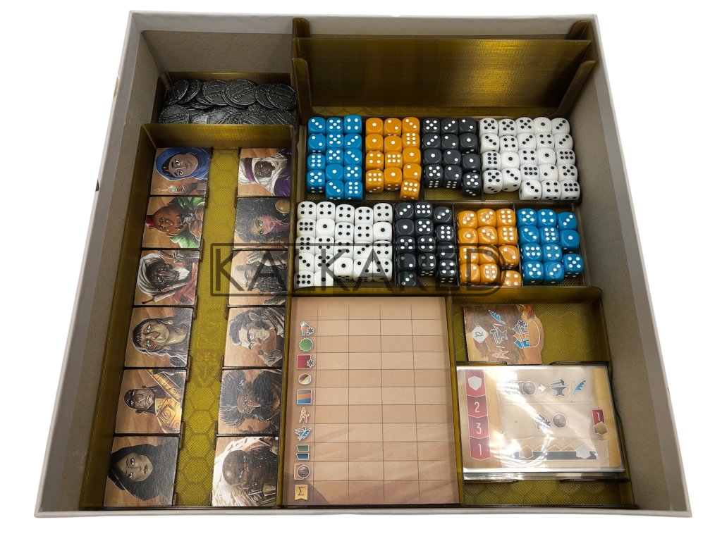 - Dokud je víko pevně přivřené, je možné insert skladovat i vertikálně. Vertikální skladování vyžaduje obě rozšíření a ideální i všechny promo desky hráčů! Krabička na daně částečně zastupuje promo materiál.
