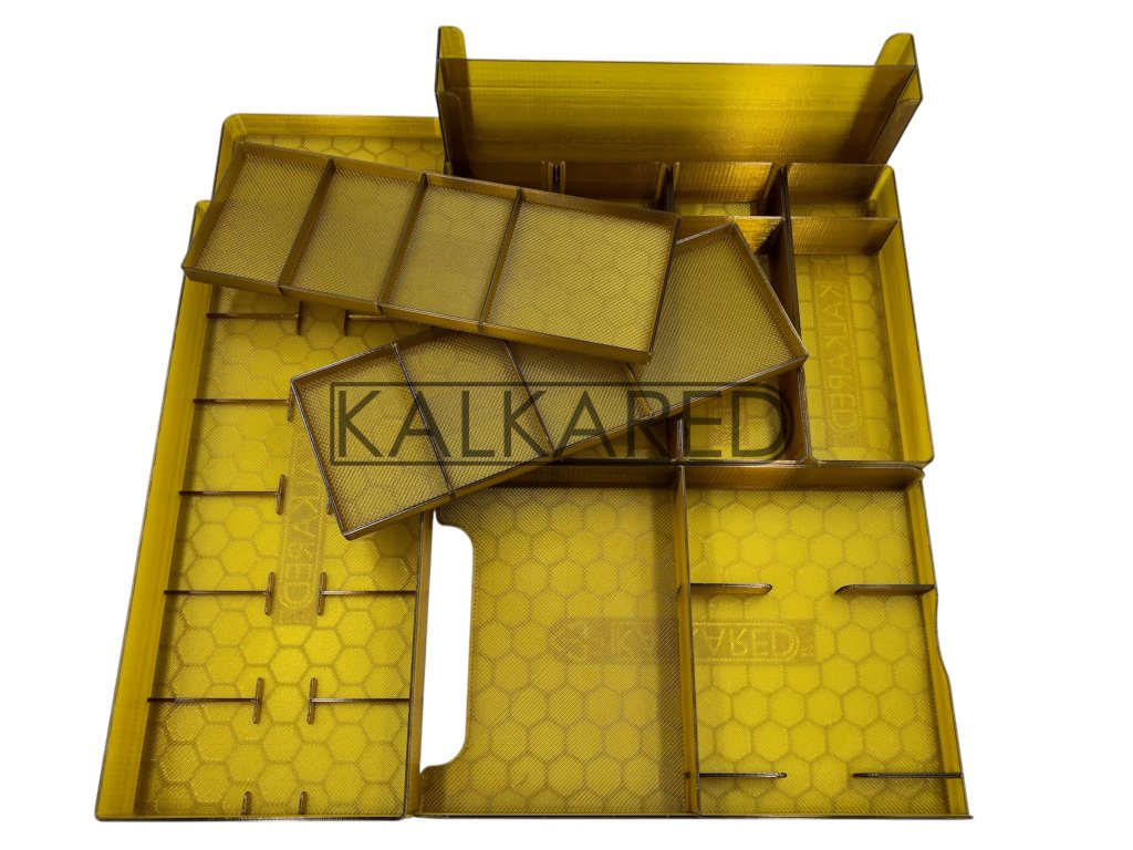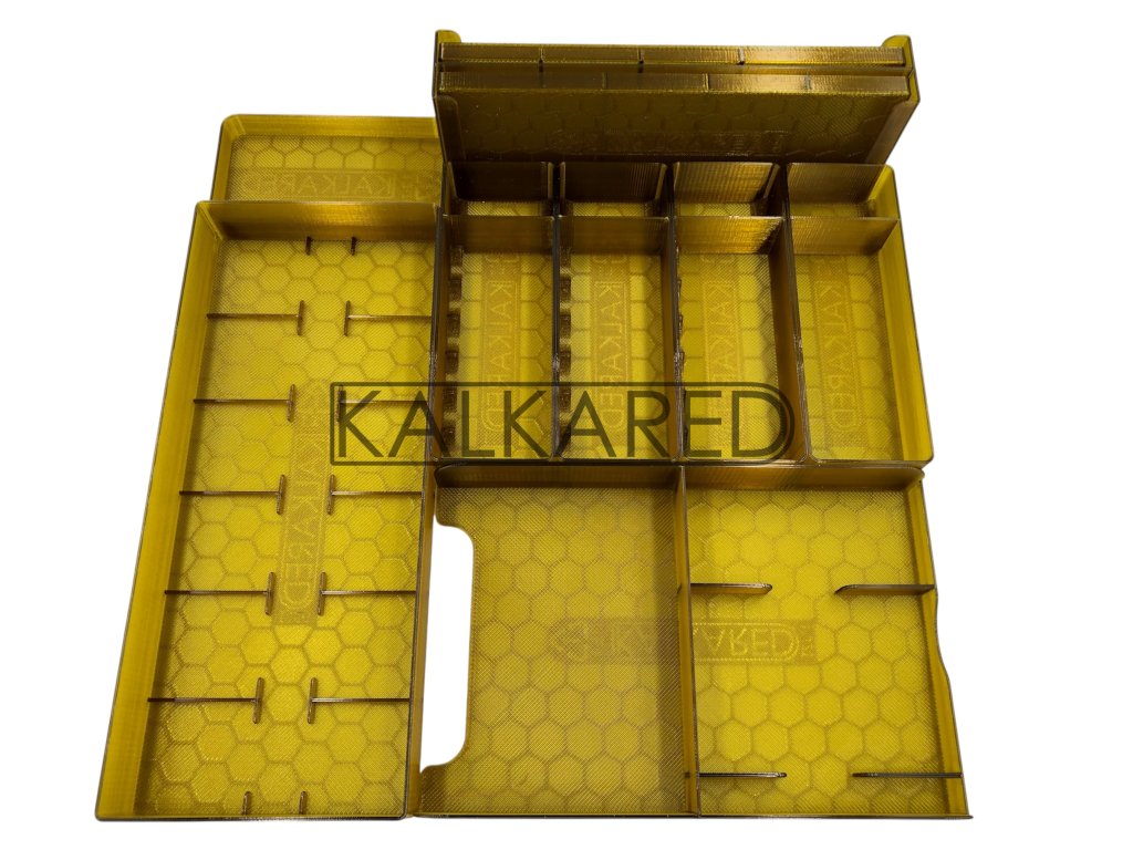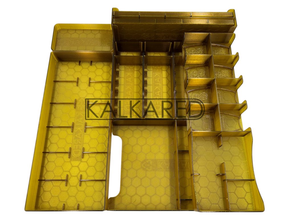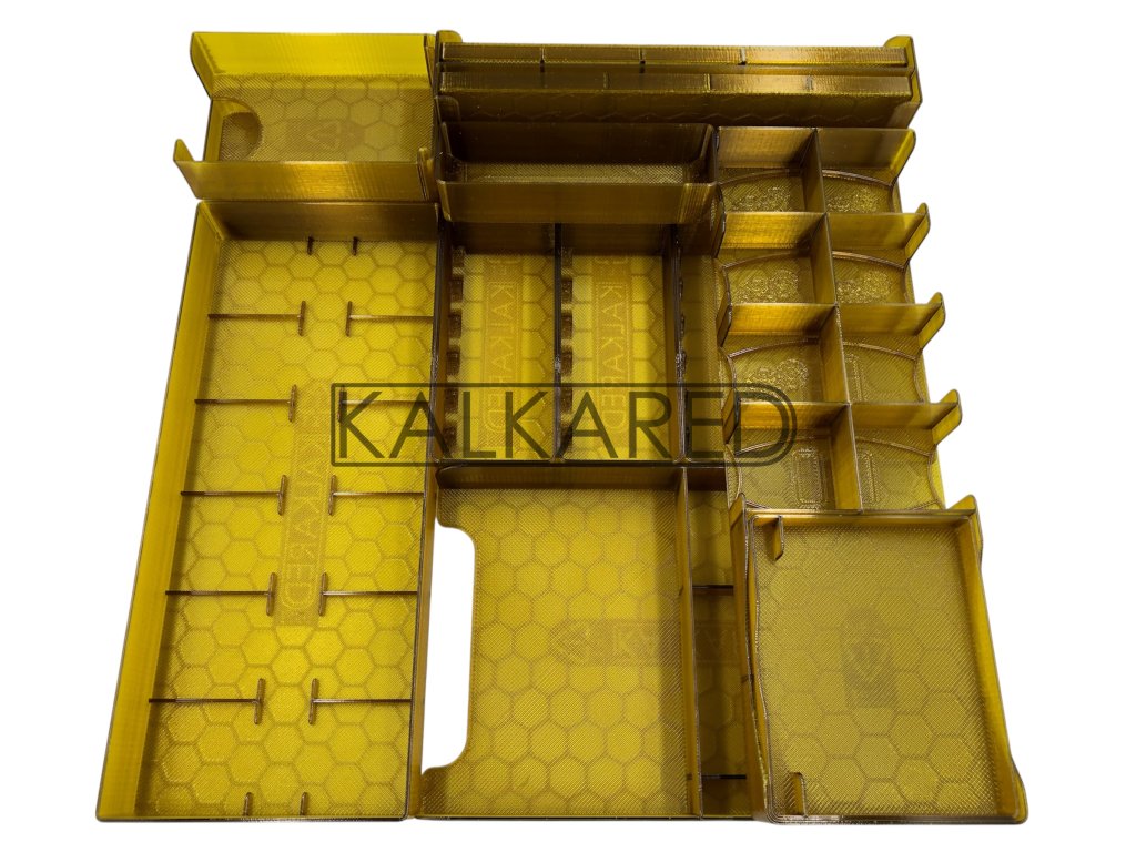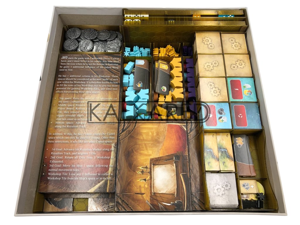 - Dokud je víko pevně přivřené, je možné insert skladovat i vertikálně. Vertikální skladování vyžaduje obě rozšíření a ideální i všechny promo desky hráčů! Krabička na daně částečně zastupuje promo materiál.