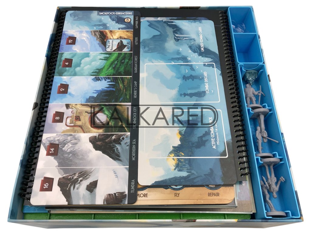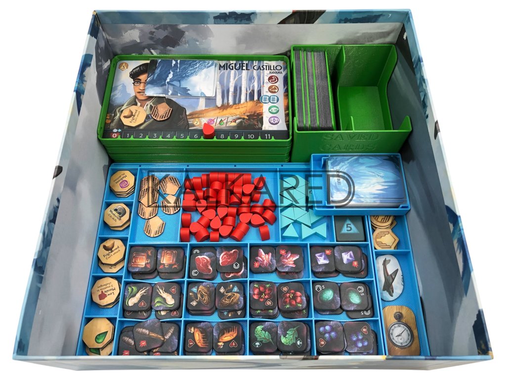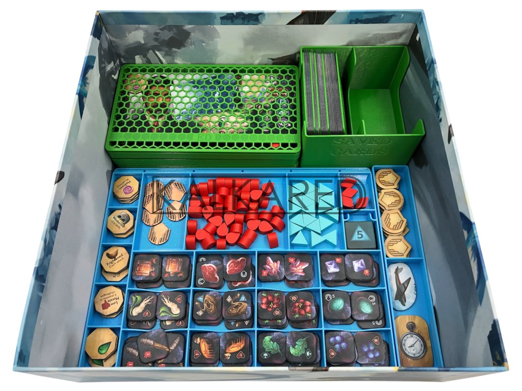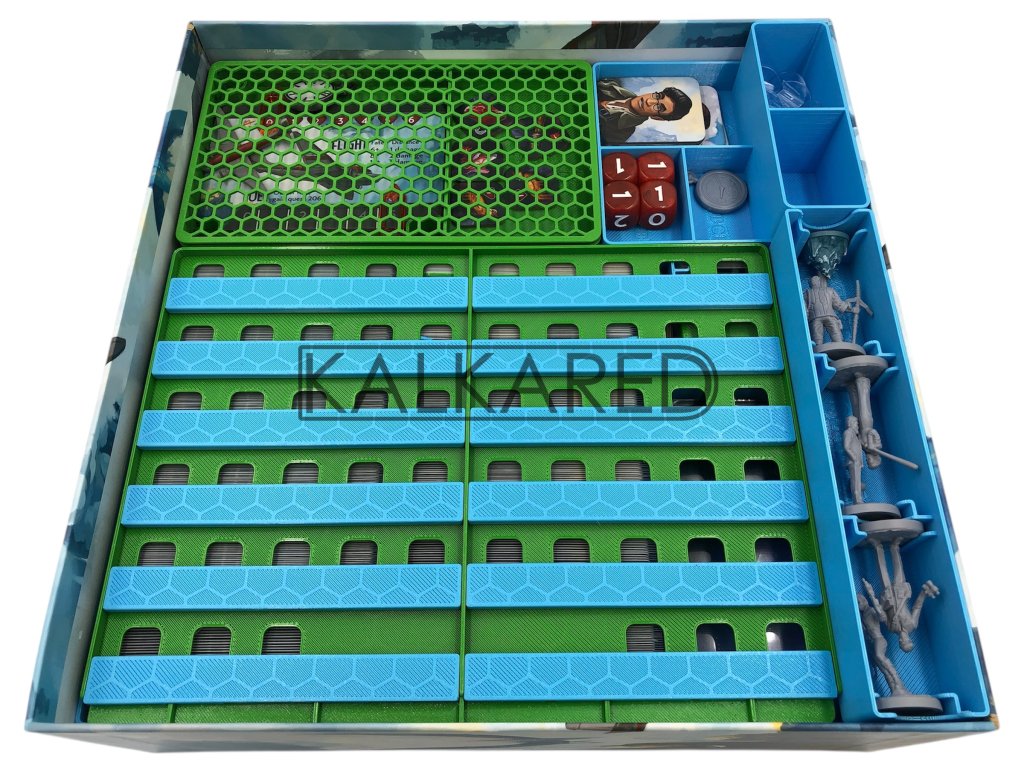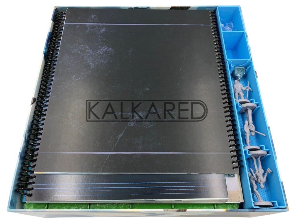 - Obsahuje ukládací krabičky pro jednotlivé postavy a karty, a hru tedy lze během minuty uložit a znovu připravit