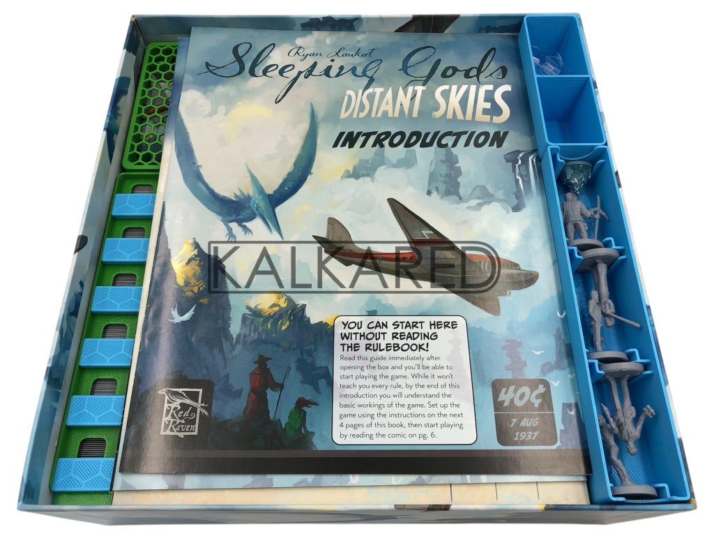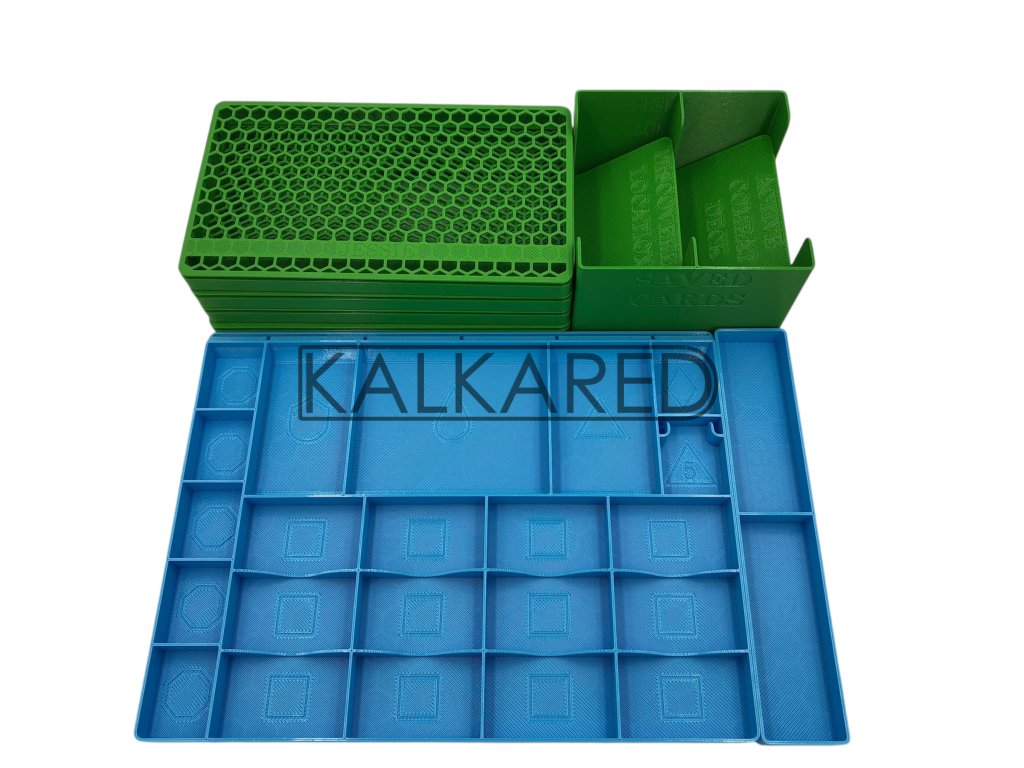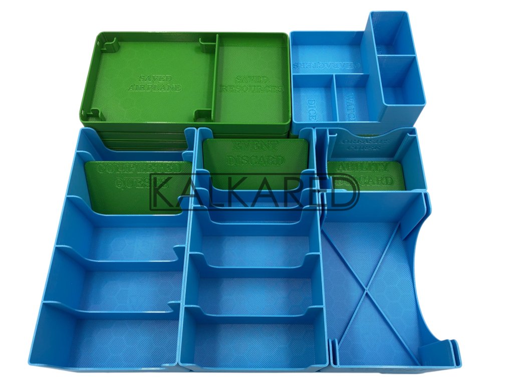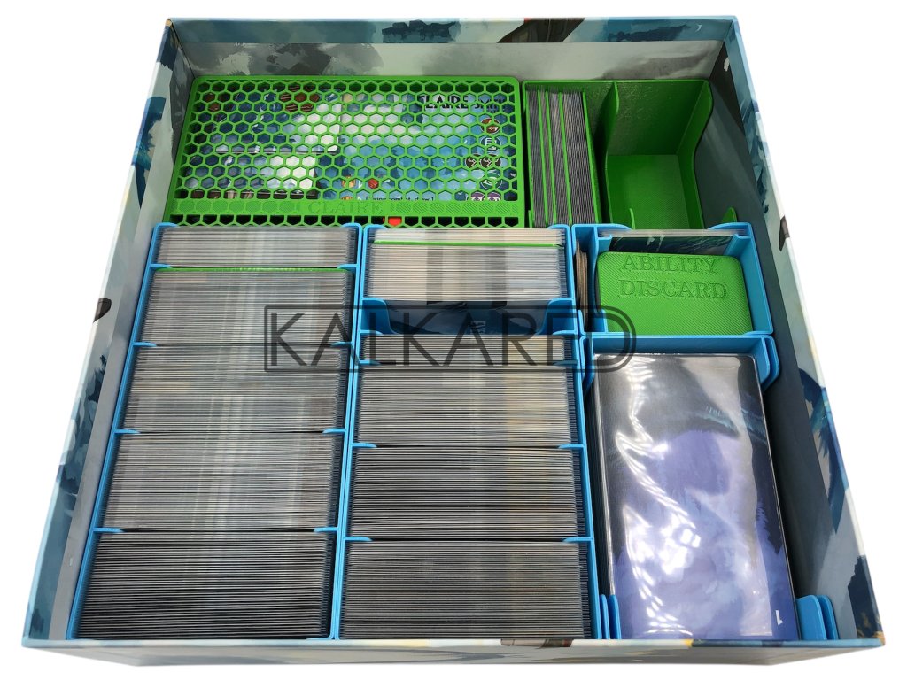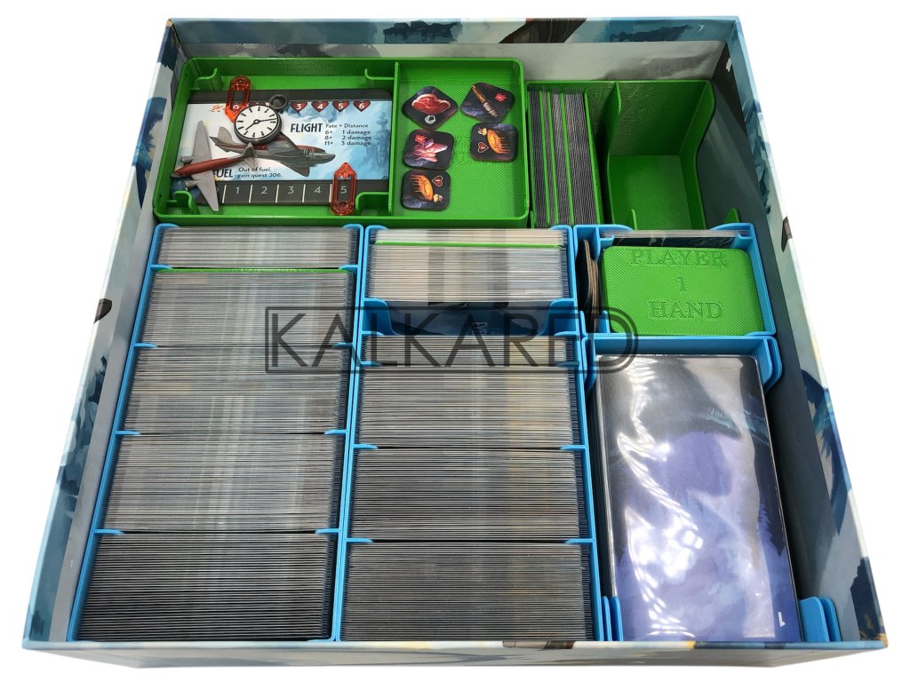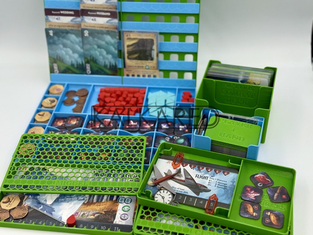 - Obsahuje ukládací krabičky pro jednotlivé postavy a karty, a hru tedy lze během minuty uložit a znovu připravit
