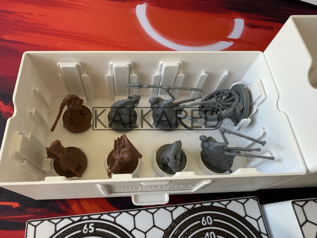 - Šuplíky pro rozpracované figurky slouží k uskladnění figurek, které jste ještě nedomalovali a nemáte je kde vyloženě skladovat, nebo s nimi chcete cestovat (Celé to funguje na principu vkládání do malých "čelistí" se správným rozměrem podle průměru základny a následné uložení do krabičky). Na výběr je z následujících velikostí šuplíků: